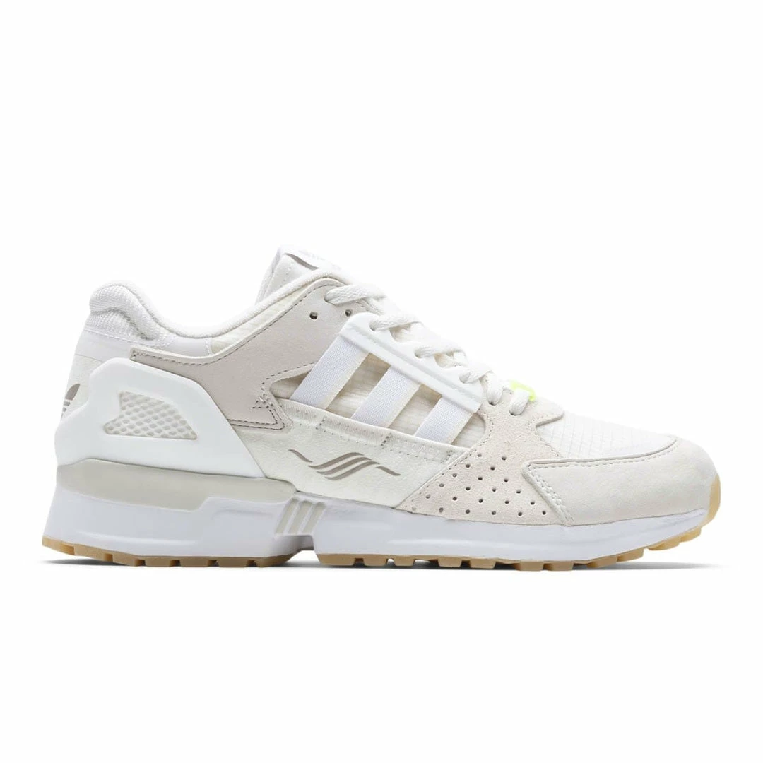 ThisΒ tonal white colorway utilizes suede panels that wrap around the sneakerΒ forΒ textural contrast while the addition of ripstopΒ fabric adds yet another dimensionΒ to theΒ lateral side of the sneaker. Three-stripes branding occupies the cutout on the side panel, while the trefoil appears on the heel.